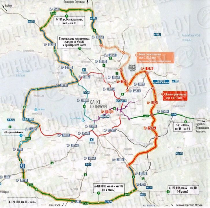 "Фонтанка.ру" также уточняет, что Автодор берет на себя новое строительство (112 км), Росавтодор — реконструкцию (35,6 км) и уширение до 4 полос в рамках капремонта (59,3 км), Ленобласть — дорогу "Петергоф - Кейкино". Существующая сеть, с которой ничего делать не надо, составляет 121,2 км. КАД-2 пойдет, в том числе, по М-11, А-120 и дамбе. строительство новой магистрали займет 3 года с начала работ.