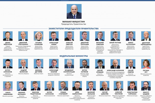 Первым заместителем председателя правительства РФ назначен Денис Мантуров. Министром промышленности и торговли занял — экс-губернатор Калининградской области Антон Алиханов, министром спорта – бывший губернатор Хабаровского края Михаил Дегтярев, министром транспорта – экс-глава Курской области Роман Старовойт, министром энергетики – экс-губернатор Кемеровской области Сергей Цивилёв, министром сельского хозяйства – Оксана Лут, которая ранее занимала в этом министерстве должность первого заместителя.