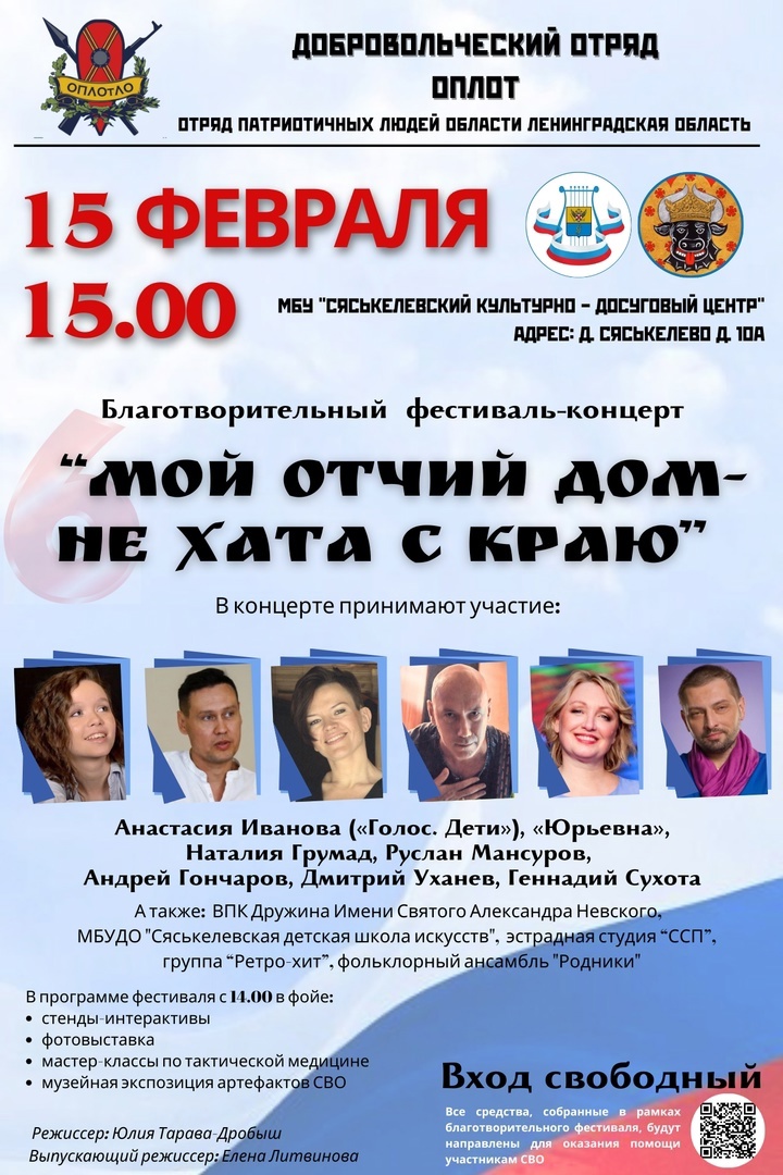15 февраля в Сяськелевском КДЦ пройдет 6-ой благотворительный фестиваль-концерт Добровольческого отряда ОПЛОТ "Мой отчий дом - не хата с краю" в поддержку военнослужащих в зоне СВО и укрепления духовного и морального единства.