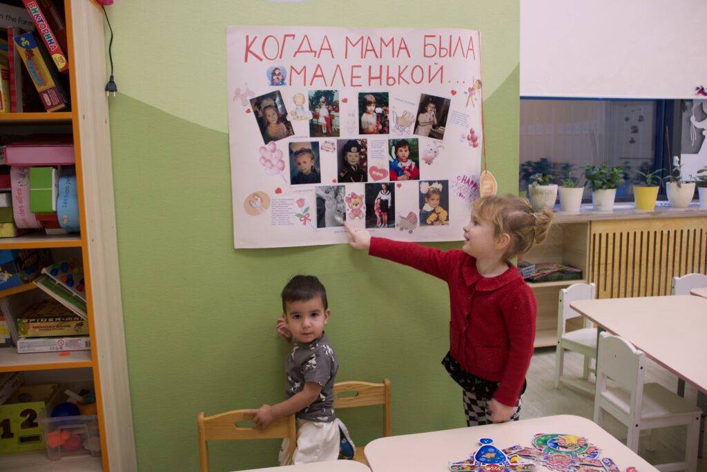 Дети уже закончили завтрак, и охотно показывали гостье свои книжки, игрушки, и тыкали пальчиком в плакат «Когда мама была маленькой…», отыскивая на нём фотографию своей мамочки.