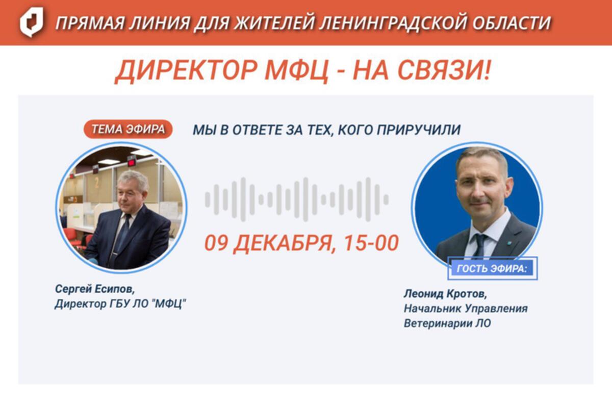 В предстоящем прямом эфире «Директор МФЦ – на связи!», который пройдет 9 декабря в 15:00, жители Ленинградской области смогут задать вопросы о ответственном обращении с животными.