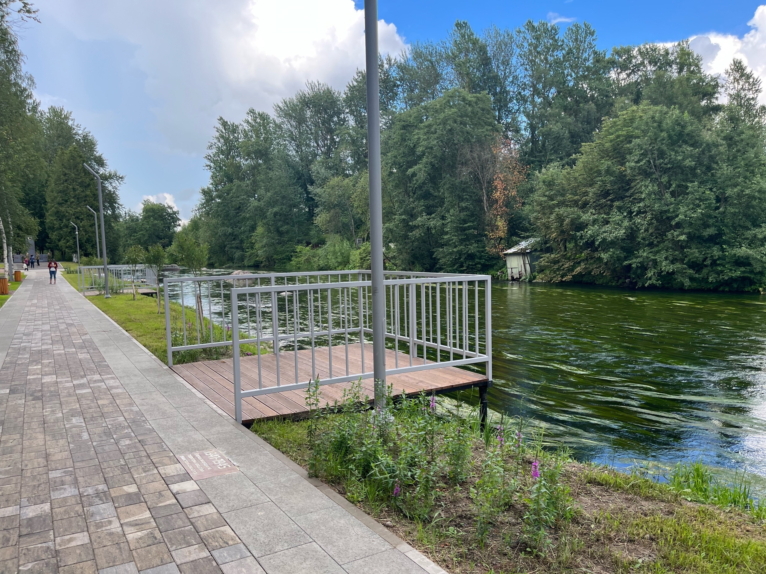 Новая территория поделена функционально: набережная в брусчатке с подвесными качелями, скамейками и смотровыми площадками, прогулочная дорожка с деревянным настилом, петляющая между берез, и, конечно, ключевая зона - мемориальная.