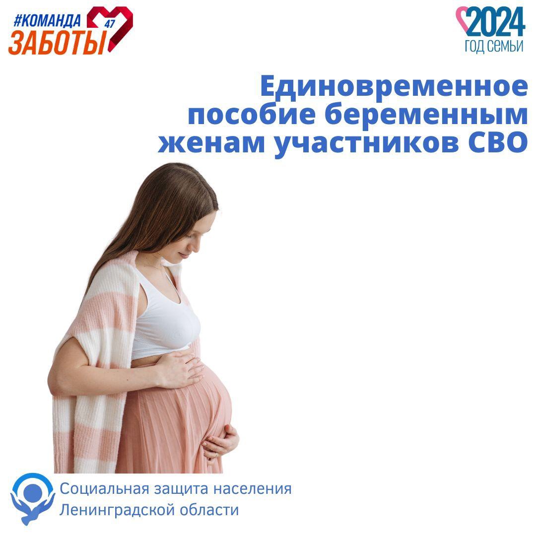 Право на получение единовременного пособия предоставляется беременным женам участников СВО, срок беременности которых составляет не менее 180 дней, имеющим на дату обращения место жительство или место пребывания на территории Ленинградской области.