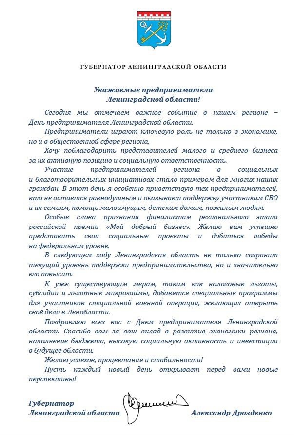 Поздравление Губернатора Ленинградской области Александра Юрьевича Дрозденко с Днём предпринимателя (смотреть в Прилодении...)