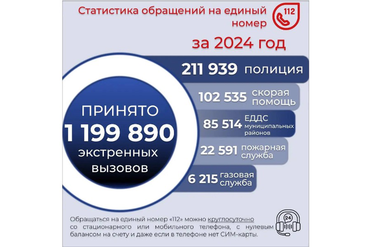 1 199 890 вызовов от жителей и гостей Ленинградской области за 2024 год приняли операторы единого номера «112». Каждый день они обрабатывали свыше 3500 обращений.