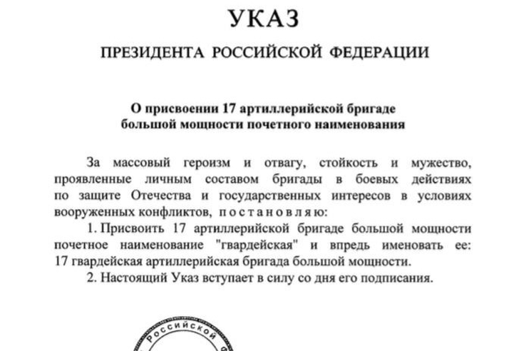 Убеждён, что вы – воины-гвардейцы – будете и впредь хранить верность Присяге, с честью служить Родине, надёжно обеспечивать безопасность и мирную жизнь наших граждан», — говорится в опубликованном на сайте kremlin.ru поздравлении президента России Владимира Путина командованию и личному составу 17 гвардейской артиллерийской бригады большой мощности.