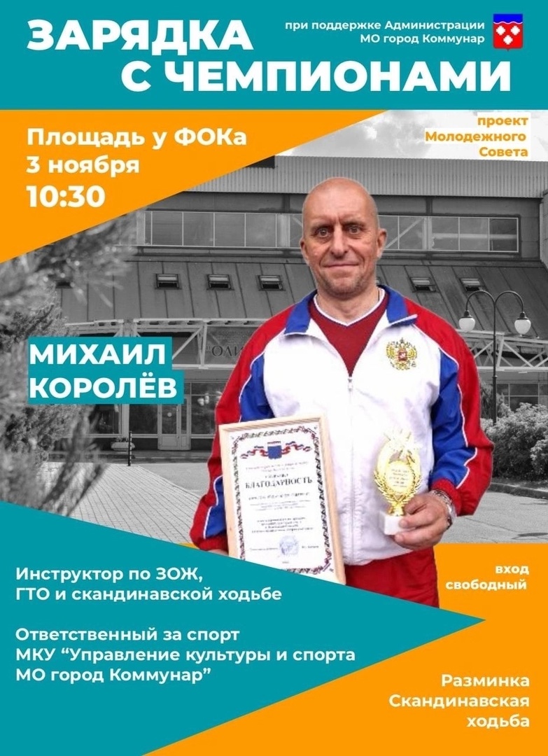 В Коммунар возвращается зарядка с чемпионом! Проект Молодежного Совета города Коммунар, реализованный при поддержке администрации города, приглашает всех желающих на занятия физкультурой.