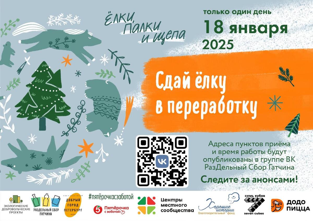 C 3 января по 9 февраля 2025 года в Санкт-Петербурге и Ленинградской области проходит традиционная посленовогодняя акция «Ёлки, палки и щепа» по сбору и переработке новогодних хвойных деревьев. Первые точки сбора открылись 3 января в Киришах, основной сбор будет проходить с 13 по 26 января.