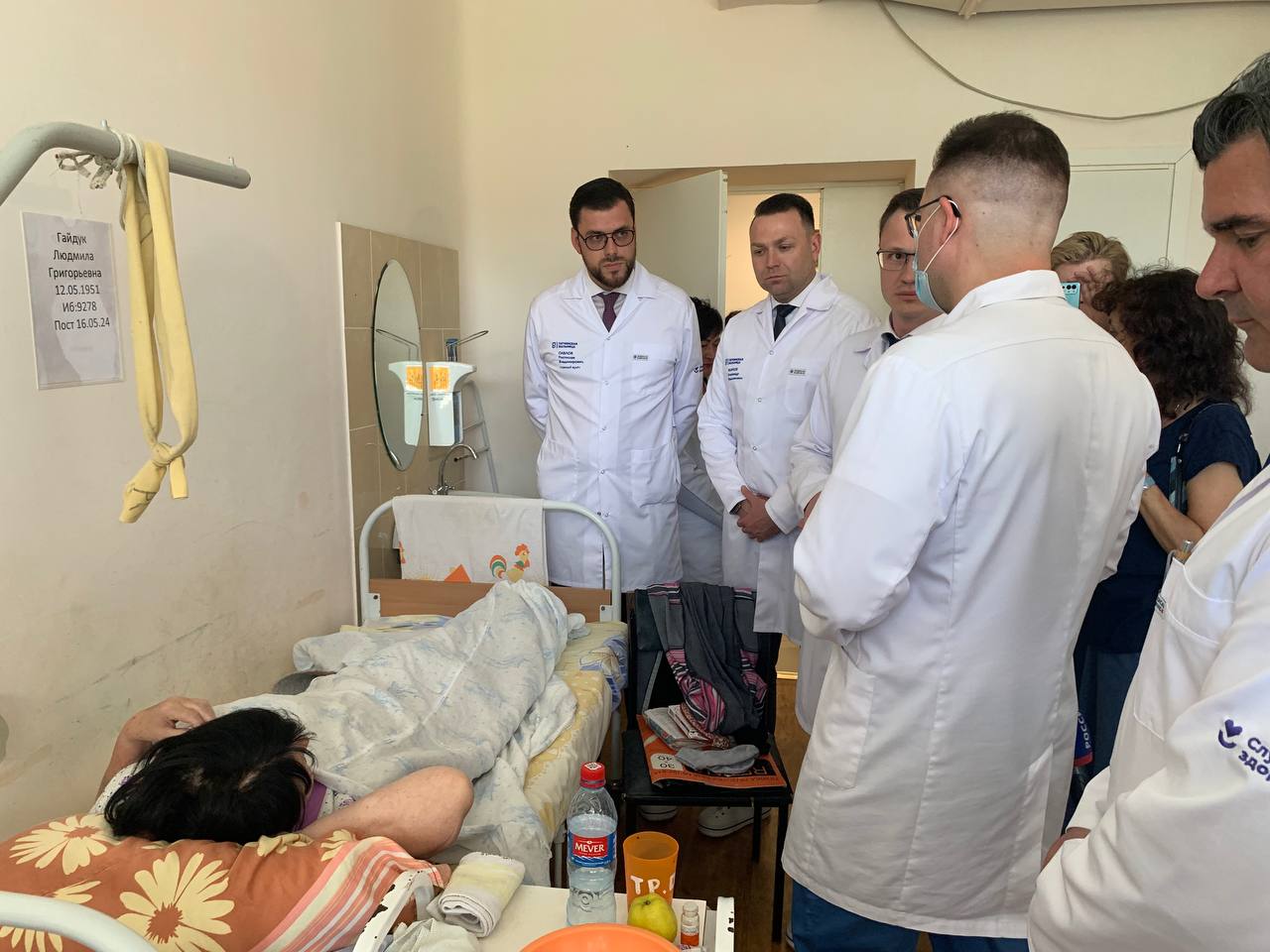 Главврач больницы Ростислав Павлов, выпускник Донецкого медуниверситета, как и вся делегация, внимательно беседует с каждым пациентом, выслушивает благодарности и жалобы, обещает решить неизбежно возникающие проблемы. Многие выбрали областную столицу по рекомендации ленинградских медиков: врачи из Гатчинской больницы неоднократно выезжали в командировки в многострадальный Донбасс, где пока ещё только мечтают о высокотехнологичной медицине.