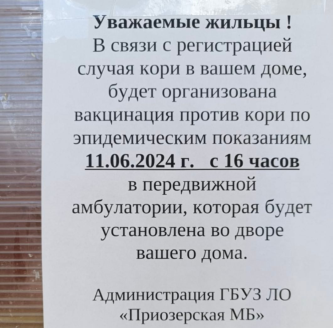 Глава Роспотребнадзора Анна Попова 11 июня заявила "о завершении подъема заболеваемости корью в России". Тем временем, 10 июня зафиксирован случай кори в многоквартирном доме в центре Приозерска. Известно, что женщине около сорока, не работает (в данном случае это имеет значение). По данным собеседников в областном комздраве, рассказала медикам, что недомогание почувствовала 5 июня, температура поднялась почти до 39-ти градусов. В больницу обращаться не стала, лечилась жаропонижающими. Через несколько дней, когда появилась сыпь на руках и теле, обратилась в местную поликлинику. Врачам рассказала, что привита от кори, но документов не нашлось.