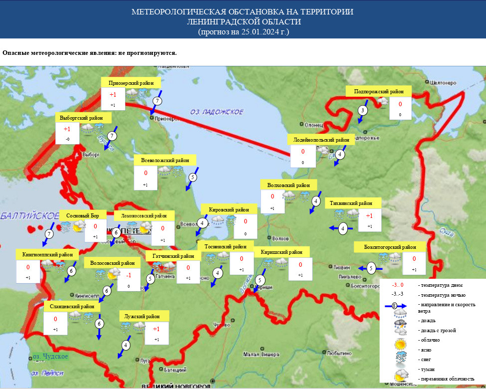 Как сообщает пресс-служба главного Управления МЧС России пол Ленинградской области со ссылкой на прогноз погоды от ФГБУ "Северо-Западное УГМС", в четверг, 25 января, на территории 47-го региона ожидается мокрый снег и облачность.