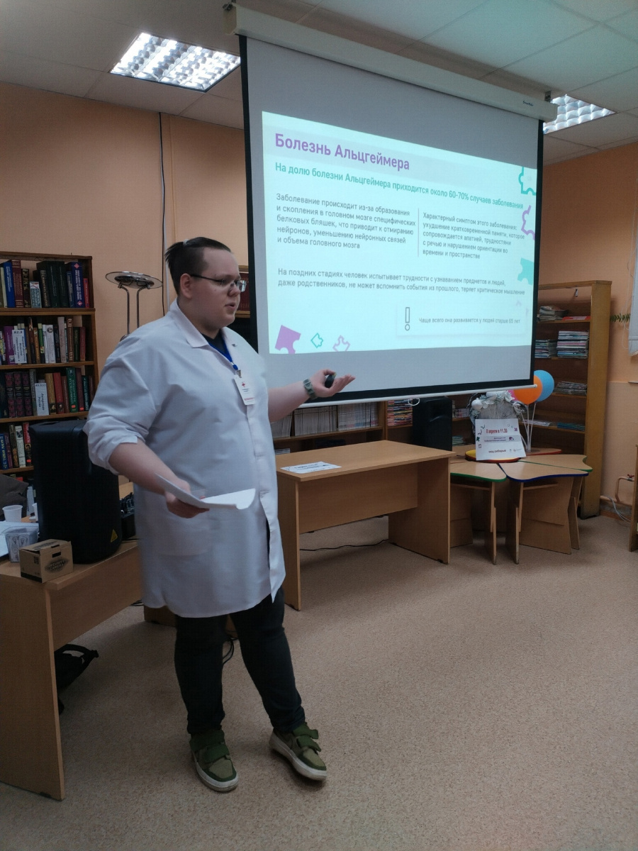 Сегодня, в рамках Всероссийской акции «Будь здоров!» посвящённой Всемирному дню здоровья, волонтёры-медики — студенты группы 11 С Филиала ГБПОУ Центр НПМР ЛО г.Выборга, провели для посетителей филиала №1 МАУК Библиотека им. А.Аалто комплексную лекции по профилактике деменции. Ребята подробно рассказали слушателям об особенностях заболевания и его профилактике. А так же показали мастер-класс по когнитивной гимнастике, направленной на формирование нейронных связей.