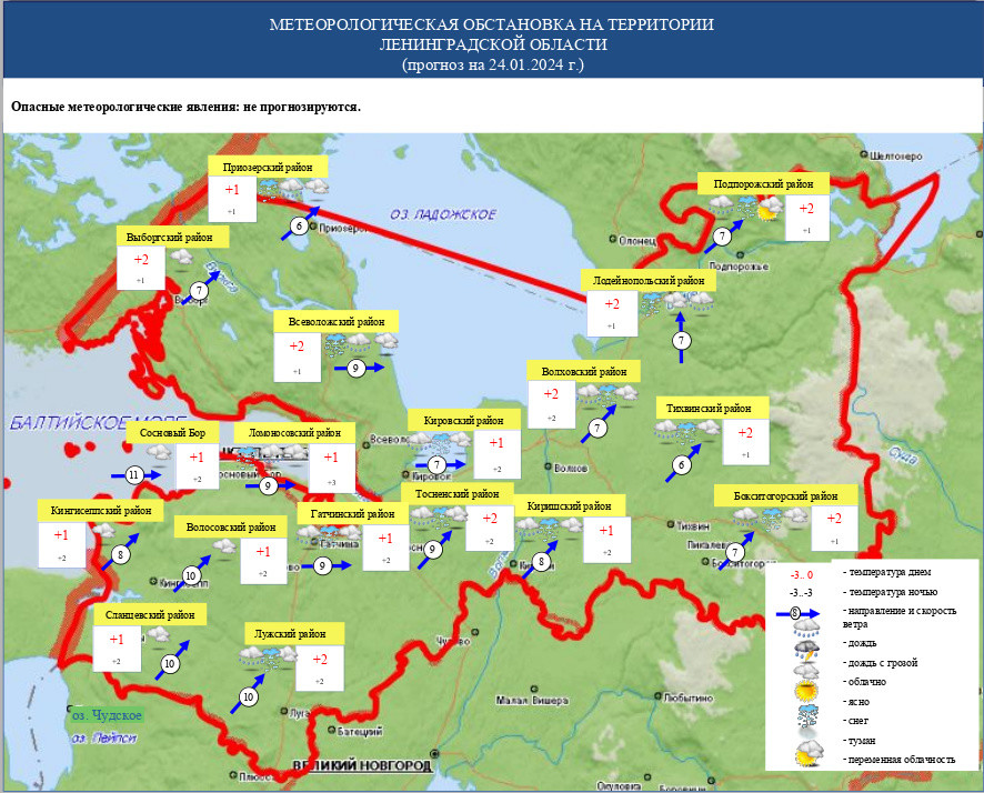 При этом воздух прогреется до +4 градусов В среду, 24 января, в Ленинградской области прогнозируется преимущественно облачная погода.